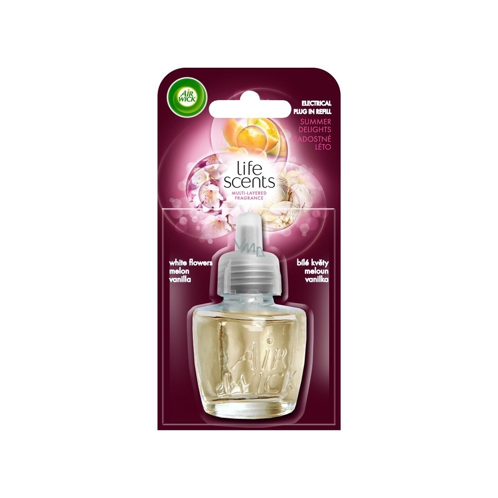Produkty z radu Air Wick zaistia, aby váš domov voňal vždy príjemne a po dlhú dobu. Náhradná náplň do elektrického osviežovača vzduchu s vôňou: Radostné leto. Hravá a príjemná vôňa, ktorá kombinuje zmes čerstvých bielych kvetov , sladkého melónu a jemné tóny vanilky . Life Scents™ je prvá neustále sa meniaca vôňa, ktorá vytvára skutočný zážitok. Objem: 19ml.